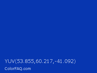 YUV 53.855,60.217,-41.092 Color is a normal blue color and the nearest color is UA Blue #0033aa. Hex code #0736b0 and RGB value is rgb(7,54,176). In RGB color space, this color is composed of 3% red, 21% green, 69% blue, In CMYK color space, this color is composed of 96% cyan, 69% magenta, 0% yellow , 31% black , In HSL color space, this color has a hue angle of 223° , 92% saturation and 36% lightness.
