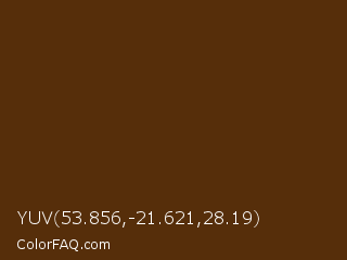 YUV 53.856,-21.621,28.19 Color is a very dark orange color and the nearest color is Cioccolato #55280c. Hex code #562e0a and RGB value is rgb(86,46,10). In RGB color space, this color is composed of 34% red, 18% green, 4% blue, In CMYK color space, this color is composed of 0% cyan, 47% magenta, 88% yellow , 66% black , In HSL color space, this color has a hue angle of 28° , 79% saturation and 19% lightness.