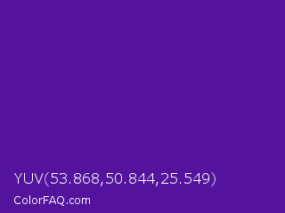 YUV 53.868,50.844,25.549 Color is a normal violet color and the nearest color is Daisy Bush #4f2398. Hex code #53139d and RGB value is rgb(83,19,157). In RGB color space, this color is composed of 33% red, 7% green, 62% blue, In CMYK color space, this color is composed of 47% cyan, 88% magenta, 0% yellow , 38% black , In HSL color space, this color has a hue angle of 268° , 78% saturation and 35% lightness.