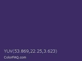 YUV 53.869,22.25,3.623 Color is a dark indigo color and the nearest color is Jacarta #3a2a6a. Hex code #3a2b63 and RGB value is rgb(58,43,99). In RGB color space, this color is composed of 23% red, 17% green, 39% blue, In CMYK color space, this color is composed of 41% cyan, 57% magenta, 0% yellow , 61% black , In HSL color space, this color has a hue angle of 256° , 39% saturation and 28% lightness.