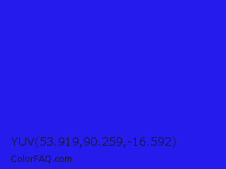 YUV 53.919,90.259,-16.592 Color is a normal indigo color and the nearest color is Bluebonnet #1c1cf0. Hex code #231ced and RGB value is rgb(35,28,237). In RGB color space, this color is composed of 14% red, 11% green, 93% blue, In CMYK color space, this color is composed of 85% cyan, 88% magenta, 0% yellow , 7% black , In HSL color space, this color has a hue angle of 242° , 85% saturation and 52% lightness.