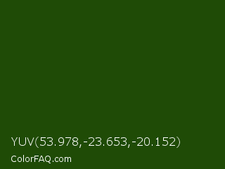 YUV 53.978,-23.653,-20.152 Color is a very dark green color and the nearest color is Green House #24500f. Hex code #1f4b06 and RGB value is rgb(31,75,6). In RGB color space, this color is composed of 12% red, 29% green, 2% blue, In CMYK color space, this color is composed of 59% cyan, 0% magenta, 92% yellow , 71% black , In HSL color space, this color has a hue angle of 98° , 85% saturation and 16% lightness.
