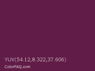 YUV 54.12,8.322,37.606 Color is a dark magenta color and the nearest color is Tawny Port #692545. Hex code #611d47 and RGB value is rgb(97,29,71). In RGB color space, this color is composed of 38% red, 11% green, 28% blue, In CMYK color space, this color is composed of 0% cyan, 70% magenta, 27% yellow , 62% black , In HSL color space, this color has a hue angle of 323° , 54% saturation and 25% lightness.