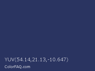 YUV 54.14,21.13,-10.647 Color is a dark blue color and the nearest color is Deep Koamaru #333366. Hex code #2a3461 and RGB value is rgb(42,52,97). In RGB color space, this color is composed of 16% red, 20% green, 38% blue, In CMYK color space, this color is composed of 57% cyan, 46% magenta, 0% yellow , 62% black , In HSL color space, this color has a hue angle of 229° , 40% saturation and 27% lightness.