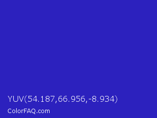 YUV 54.187,66.956,-8.934 Color is a normal indigo color and the nearest color is Interdimensional Blue #360ccc. Hex code #2c21be and RGB value is rgb(44,33,190). In RGB color space, this color is composed of 17% red, 13% green, 75% blue, In CMYK color space, this color is composed of 77% cyan, 83% magenta, 0% yellow , 25% black , In HSL color space, this color has a hue angle of 244° , 70% saturation and 44% lightness.