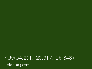 YUV 54.211,-20.317,-16.848 Color is a very dark green color and the nearest color is Green House #24500f. Hex code #23480d and RGB value is rgb(35,72,13). In RGB color space, this color is composed of 14% red, 28% green, 5% blue, In CMYK color space, this color is composed of 51% cyan, 0% magenta, 82% yellow , 72% black , In HSL color space, this color has a hue angle of 98° , 69% saturation and 17% lightness.