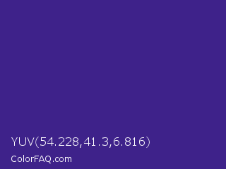 YUV 54.228,41.3,6.816 Color is a normal indigo color and the nearest color is Spanish Violet #4c2882. Hex code #3e228a and RGB value is rgb(62,34,138). In RGB color space, this color is composed of 24% red, 13% green, 54% blue, In CMYK color space, this color is composed of 55% cyan, 75% magenta, 0% yellow , 46% black , In HSL color space, this color has a hue angle of 256° , 60% saturation and 34% lightness.