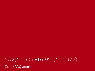 YUV 54.306,-16.913,104.972 Color is a normal red color and the nearest color is Bright Red #b10000. Hex code #ae0014 and RGB value is rgb(174,-0,20). In RGB color space, this color is composed of 68% red, 0% green, 8% blue, In CMYK color space, this color is composed of 0% cyan, 100% magenta, 89% yellow , 32% black , In HSL color space, this color has a hue angle of 353° , 100% saturation and 34% lightness.