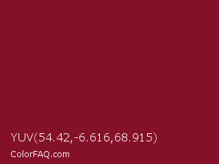YUV 54.42,-6.616,68.915 Color is a dark red color and the nearest color is Merlot #831923. Hex code #851129 and RGB value is rgb(133,17,41). In RGB color space, this color is composed of 52% red, 7% green, 16% blue, In CMYK color space, this color is composed of 0% cyan, 87% magenta, 69% yellow , 48% black , In HSL color space, this color has a hue angle of 348° , 77% saturation and 29% lightness.