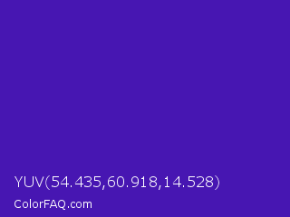 YUV 54.435,60.918,14.528 Color is a normal indigo color and the nearest color is Daisy Bush #4f2398. Hex code #4716b2 and RGB value is rgb(71,22,178). In RGB color space, this color is composed of 28% red, 9% green, 70% blue, In CMYK color space, this color is composed of 60% cyan, 88% magenta, 0% yellow , 30% black , In HSL color space, this color has a hue angle of 259° , 78% saturation and 39% lightness.