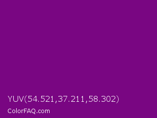 YUV 54.521,37.211,58.302 Color is a dark magenta color and the nearest color is Patriarch #800080. Hex code #790682 and RGB value is rgb(121,6,130). In RGB color space, this color is composed of 47% red, 2% green, 51% blue, In CMYK color space, this color is composed of 7% cyan, 95% magenta, 0% yellow , 49% black , In HSL color space, this color has a hue angle of 296° , 91% saturation and 27% lightness.