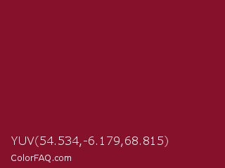 YUV 54.534,-6.179,68.815 Color is a dark red color and the nearest color is Antique Ruby #841b2d. Hex code #85112a and RGB value is rgb(133,17,42). In RGB color space, this color is composed of 52% red, 7% green, 16% blue, In CMYK color space, this color is composed of 0% cyan, 87% magenta, 68% yellow , 48% black , In HSL color space, this color has a hue angle of 347° , 77% saturation and 29% lightness.
