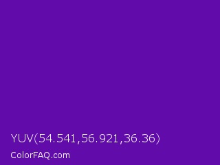 YUV 54.541,56.921,36.36 Color is a normal purple color and the nearest color is Purple #660099. Hex code #600baa and RGB value is rgb(96,11,170). In RGB color space, this color is composed of 38% red, 4% green, 67% blue, In CMYK color space, this color is composed of 44% cyan, 94% magenta, 0% yellow , 33% black , In HSL color space, this color has a hue angle of 272° , 88% saturation and 35% lightness.