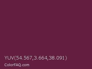 YUV 54.567,3.664,38.091 Color is a dark rose color and the nearest color is Tawny Port #692545. Hex code #621f3e and RGB value is rgb(98,31,62). In RGB color space, this color is composed of 38% red, 12% green, 24% blue, In CMYK color space, this color is composed of 0% cyan, 68% magenta, 37% yellow , 62% black , In HSL color space, this color has a hue angle of 332° , 52% saturation and 25% lightness.