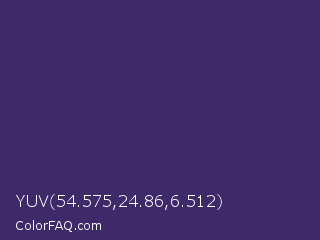 YUV 54.575,24.86,6.512 Color is a dark indigo color and the nearest color is Jacarta #3a2a6a. Hex code #3e2969 and RGB value is rgb(62,41,105). In RGB color space, this color is composed of 24% red, 16% green, 41% blue, In CMYK color space, this color is composed of 41% cyan, 61% magenta, 0% yellow , 59% black , In HSL color space, this color has a hue angle of 260° , 44% saturation and 29% lightness.