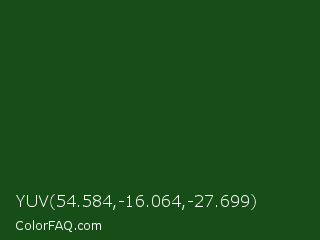 YUV 54.584,-16.064,-27.699 Color is a very dark green color and the nearest color is Parsley #134f19. Hex code #174d16 and RGB value is rgb(23,77,22). In RGB color space, this color is composed of 9% red, 30% green, 9% blue, In CMYK color space, this color is composed of 70% cyan, 0% magenta, 71% yellow , 70% black , In HSL color space, this color has a hue angle of 119° , 56% saturation and 19% lightness.