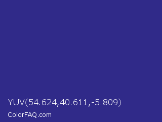 YUV 54.624,40.611,-5.809 Color is a normal indigo color and the nearest color is Cosmic Cobalt #2e2d88. Hex code #302a89 and RGB value is rgb(48,42,137). In RGB color space, this color is composed of 19% red, 16% green, 54% blue, In CMYK color space, this color is composed of 65% cyan, 69% magenta, 0% yellow , 46% black , In HSL color space, this color has a hue angle of 244° , 53% saturation and 35% lightness.