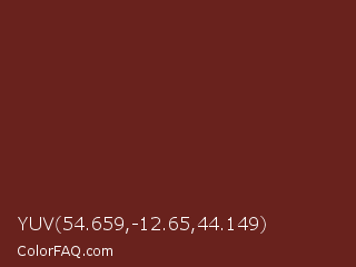 YUV 54.659,-12.65,44.149 Color is a dark red color and the nearest color is Persian Plum #701c1c. Hex code #69221d and RGB value is rgb(105,34,29). In RGB color space, this color is composed of 41% red, 13% green, 11% blue, In CMYK color space, this color is composed of 0% cyan, 68% magenta, 72% yellow , 59% black , In HSL color space, this color has a hue angle of 4° , 57% saturation and 26% lightness.