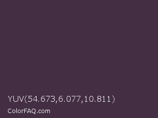 YUV 54.673,6.077,10.811 Color is a very dark magenta color and the nearest color is Ship Gray #3e3a44. Hex code #432e43 and RGB value is rgb(67,46,67). In RGB color space, this color is composed of 26% red, 18% green, 26% blue, In CMYK color space, this color is composed of 0% cyan, 31% magenta, 0% yellow , 74% black , In HSL color space, this color has a hue angle of 300° , 19% saturation and 22% lightness.