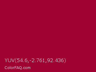 YUV 54.6,-2.761,92.436 Color is a normal rose color and the nearest color is Pink Raspberry #980036. Hex code #a00231 and RGB value is rgb(160,2,49). In RGB color space, this color is composed of 63% red, 1% green, 19% blue, In CMYK color space, this color is composed of 0% cyan, 99% magenta, 69% yellow , 37% black , In HSL color space, this color has a hue angle of 342° , 98% saturation and 32% lightness.