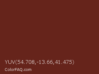 YUV 54.708,-13.66,41.475 Color is a dark red color and the nearest color is Espresso #612718. Hex code #66241b and RGB value is rgb(102,36,27). In RGB color space, this color is composed of 40% red, 14% green, 11% blue, In CMYK color space, this color is composed of 0% cyan, 65% magenta, 74% yellow , 60% black , In HSL color space, this color has a hue angle of 7° , 58% saturation and 25% lightness.