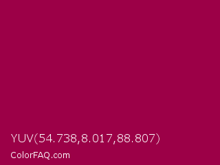 YUV 54.738,8.017,88.807 Color is a normal rose color and the nearest color is Pink Raspberry #980036. Hex code #9c0047 and RGB value is rgb(156,-0,71). In RGB color space, this color is composed of 61% red, 0% green, 28% blue, In CMYK color space, this color is composed of 0% cyan, 100% magenta, 54% yellow , 39% black , In HSL color space, this color has a hue angle of 333° , 100% saturation and 31% lightness.