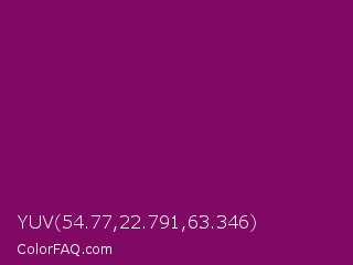 YUV 54.77,22.791,63.346 Color is a dark magenta color and the nearest color is Cardinal Pink #8c055e. Hex code #7f0965 and RGB value is rgb(127,9,101). In RGB color space, this color is composed of 50% red, 4% green, 40% blue, In CMYK color space, this color is composed of 0% cyan, 93% magenta, 20% yellow , 50% black , In HSL color space, this color has a hue angle of 313° , 87% saturation and 27% lightness.