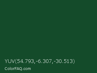 YUV 54.793,-6.307,-30.513 Color is a very dark green color and the nearest color is Cal Poly Pomona Green #1e4d2b. Hex code #144b2a and RGB value is rgb(20,75,42). In RGB color space, this color is composed of 8% red, 29% green, 16% blue, In CMYK color space, this color is composed of 73% cyan, 0% magenta, 44% yellow , 71% black , In HSL color space, this color has a hue angle of 144° , 58% saturation and 19% lightness.