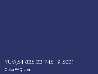 YUV 54.835,23.745,-9.502 Color is a dark blue color and the nearest color is Deep Koamaru #333366. Hex code #2c3367 and RGB value is rgb(44,51,103). In RGB color space, this color is composed of 17% red, 20% green, 40% blue, In CMYK color space, this color is composed of 57% cyan, 50% magenta, 0% yellow , 60% black , In HSL color space, this color has a hue angle of 233° , 40% saturation and 29% lightness.