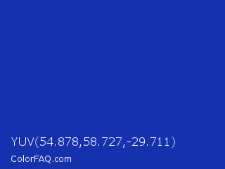 YUV 54.878,58.727,-29.711 Color is a normal blue color and the nearest color is Egyptian Blue #1034a6. Hex code #1531ae and RGB value is rgb(21,49,174). In RGB color space, this color is composed of 8% red, 19% green, 68% blue, In CMYK color space, this color is composed of 88% cyan, 72% magenta, 0% yellow , 32% black , In HSL color space, this color has a hue angle of 229° , 78% saturation and 38% lightness.