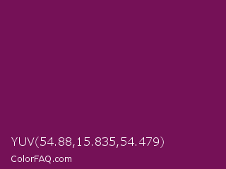 YUV 54.88,15.835,54.479 Color is a dark magenta color and the nearest color is French Plum #811453. Hex code #751157 and RGB value is rgb(117,17,87). In RGB color space, this color is composed of 46% red, 7% green, 34% blue, In CMYK color space, this color is composed of 0% cyan, 85% magenta, 26% yellow , 54% black , In HSL color space, this color has a hue angle of 318° , 75% saturation and 26% lightness.