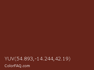 YUV 54.893,-14.244,42.19 Color is a dark red color and the nearest color is Espresso #612718. Hex code #67241a and RGB value is rgb(103,36,26). In RGB color space, this color is composed of 40% red, 14% green, 10% blue, In CMYK color space, this color is composed of 0% cyan, 65% magenta, 75% yellow , 60% black , In HSL color space, this color has a hue angle of 8° , 60% saturation and 25% lightness.