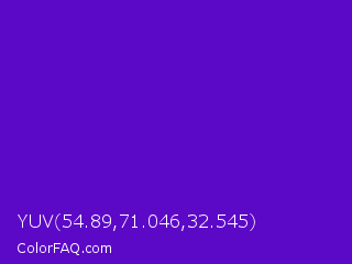 YUV 54.89,71.046,32.545 Color is a normal violet color and the nearest color is Interdimensional Blue #360ccc. Hex code #5c08c7 and RGB value is rgb(92,8,199). In RGB color space, this color is composed of 36% red, 3% green, 78% blue, In CMYK color space, this color is composed of 54% cyan, 96% magenta, 0% yellow , 22% black , In HSL color space, this color has a hue angle of 266° , 92% saturation and 41% lightness.