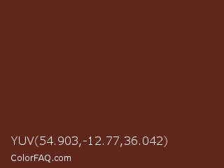 YUV 54.903,-12.77,36.042 Color is a dark red color and the nearest color is Espresso #612718. Hex code #60271d and RGB value is rgb(96,39,29). In RGB color space, this color is composed of 38% red, 15% green, 11% blue, In CMYK color space, this color is composed of 0% cyan, 59% magenta, 70% yellow , 62% black , In HSL color space, this color has a hue angle of 9° , 54% saturation and 25% lightness.