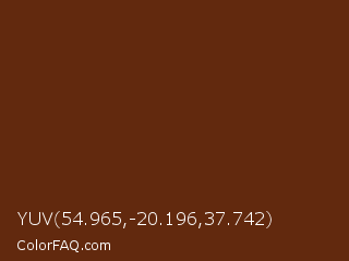 YUV 54.965,-20.196,37.742 Color is a very dark orange color and the nearest color is Seal Brown #59260b. Hex code #62290e and RGB value is rgb(98,41,14). In RGB color space, this color is composed of 38% red, 16% green, 5% blue, In CMYK color space, this color is composed of 0% cyan, 58% magenta, 86% yellow , 62% black , In HSL color space, this color has a hue angle of 19° , 75% saturation and 22% lightness.