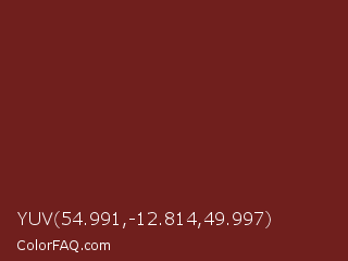 YUV 54.991,-12.814,49.997 Color is a dark red color and the nearest color is Persian Plum #701c1c. Hex code #701f1d and RGB value is rgb(112,31,29). In RGB color space, this color is composed of 44% red, 12% green, 11% blue, In CMYK color space, this color is composed of 0% cyan, 72% magenta, 74% yellow , 56% black , In HSL color space, this color has a hue angle of 1° , 59% saturation and 28% lightness.
