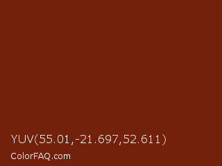 YUV 55.01,-21.697,52.611 Color is a dark red color and the nearest color is Moccaccino #6e1d14. Hex code #73210b and RGB value is rgb(115,33,11). In RGB color space, this color is composed of 45% red, 13% green, 4% blue, In CMYK color space, this color is composed of 0% cyan, 71% magenta, 90% yellow , 55% black , In HSL color space, this color has a hue angle of 13° , 83% saturation and 25% lightness.