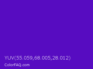 YUV 55.059,68.005,28.012 Color is a normal violet color and the nearest color is Interdimensional Blue #360ccc. Hex code #570cc1 and RGB value is rgb(87,12,193). In RGB color space, this color is composed of 34% red, 5% green, 76% blue, In CMYK color space, this color is composed of 55% cyan, 94% magenta, 0% yellow , 24% black , In HSL color space, this color has a hue angle of 265° , 88% saturation and 40% lightness.