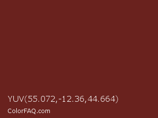 YUV 55.072,-12.36,44.664 Color is a dark red color and the nearest color is Persian Plum #701c1c. Hex code #6a221e and RGB value is rgb(106,34,30). In RGB color space, this color is composed of 42% red, 13% green, 12% blue, In CMYK color space, this color is composed of 0% cyan, 68% magenta, 72% yellow , 58% black , In HSL color space, this color has a hue angle of 3° , 56% saturation and 27% lightness.