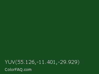 YUV 55.126,-11.401,-29.929 Color is a very dark green color and the nearest color is Parsley #134f19. Hex code #154d20 and RGB value is rgb(21,77,32). In RGB color space, this color is composed of 8% red, 30% green, 13% blue, In CMYK color space, this color is composed of 73% cyan, 0% magenta, 58% yellow , 70% black , In HSL color space, this color has a hue angle of 132° , 57% saturation and 19% lightness.