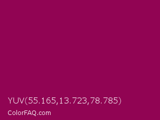 YUV 55.165,13.723,78.785 Color is a dark magenta color and the nearest color is Cardinal Pink #8c055e. Hex code #910453 and RGB value is rgb(145,4,83). In RGB color space, this color is composed of 57% red, 2% green, 33% blue, In CMYK color space, this color is composed of 0% cyan, 97% magenta, 43% yellow , 43% black , In HSL color space, this color has a hue angle of 326° , 95% saturation and 29% lightness.
