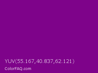 YUV 55.167,40.837,62.121 Color is a dark magenta color and the nearest color is Patriarch #800080. Hex code #7e038a and RGB value is rgb(126,3,138). In RGB color space, this color is composed of 49% red, 1% green, 54% blue, In CMYK color space, this color is composed of 9% cyan, 98% magenta, 0% yellow , 46% black , In HSL color space, this color has a hue angle of 295° , 96% saturation and 28% lightness.