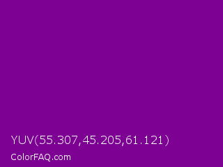 YUV 55.307,45.205,61.121 Color is a dark purple color and the nearest color is Dark Magenta #8b008b. Hex code #7d0293 and RGB value is rgb(125,2,147). In RGB color space, this color is composed of 49% red, 1% green, 58% blue, In CMYK color space, this color is composed of 15% cyan, 99% magenta, 0% yellow , 42% black , In HSL color space, this color has a hue angle of 291° , 97% saturation and 29% lightness.
