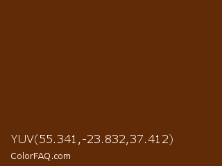 YUV 55.341,-23.832,37.412 Color is a very dark orange color and the nearest color is Carnaby Tan #5c2e01. Hex code #622b07 and RGB value is rgb(98,43,7). In RGB color space, this color is composed of 38% red, 17% green, 3% blue, In CMYK color space, this color is composed of 0% cyan, 56% magenta, 93% yellow , 62% black , In HSL color space, this color has a hue angle of 24° , 87% saturation and 21% lightness.