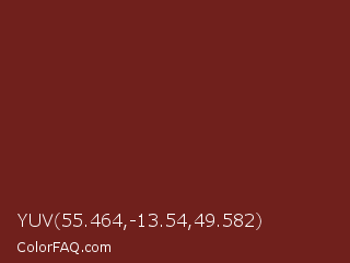 YUV 55.464,-13.54,49.582 Color is a dark red color and the nearest color is Persian Plum #701c1c. Hex code #70201c and RGB value is rgb(112,32,28). In RGB color space, this color is composed of 44% red, 13% green, 11% blue, In CMYK color space, this color is composed of 0% cyan, 71% magenta, 75% yellow , 56% black , In HSL color space, this color has a hue angle of 3° , 60% saturation and 27% lightness.