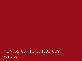 YUV 55.63,-15.101,83.639 Color is a normal red color and the nearest color is Ruby Red #9b111e. Hex code #970d19 and RGB value is rgb(151,13,25). In RGB color space, this color is composed of 59% red, 5% green, 10% blue, In CMYK color space, this color is composed of 0% cyan, 91% magenta, 83% yellow , 41% black , In HSL color space, this color has a hue angle of 355° , 84% saturation and 32% lightness.