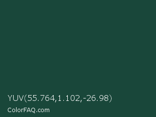YUV 55.764,1.102,-26.98 Color is a very dark green color and the nearest color is MSU Green #18453b. Hex code #19473a and RGB value is rgb(25,71,58). In RGB color space, this color is composed of 10% red, 28% green, 23% blue, In CMYK color space, this color is composed of 65% cyan, 0% magenta, 18% yellow , 72% black , In HSL color space, this color has a hue angle of 163° , 48% saturation and 19% lightness.