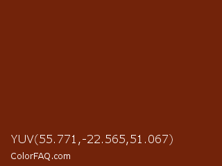 YUV 55.771,-22.565,51.067 Color is a dark red color and the nearest color is Moccaccino #6e1d14. Hex code #72230a and RGB value is rgb(114,35,10). In RGB color space, this color is composed of 45% red, 14% green, 4% blue, In CMYK color space, this color is composed of 0% cyan, 69% magenta, 91% yellow , 55% black , In HSL color space, this color has a hue angle of 14° , 84% saturation and 24% lightness.