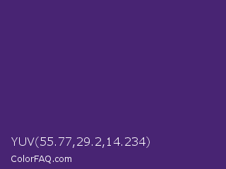 YUV 55.77,29.2,14.234 Color is a dark violet color and the nearest color is Honey Flower #4f1c70. Hex code #482473 and RGB value is rgb(72,36,115). In RGB color space, this color is composed of 28% red, 14% green, 45% blue, In CMYK color space, this color is composed of 37% cyan, 69% magenta, 0% yellow , 55% black , In HSL color space, this color has a hue angle of 267° , 52% saturation and 30% lightness.