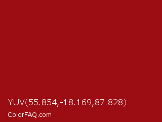 YUV 55.854,-18.169,87.828 Color is a normal red color and the nearest color is Spartan Crimson #9e1316. Hex code #9c0c13 and RGB value is rgb(156,12,19). In RGB color space, this color is composed of 61% red, 5% green, 7% blue, In CMYK color space, this color is composed of 0% cyan, 92% magenta, 88% yellow , 39% black , In HSL color space, this color has a hue angle of 357° , 86% saturation and 33% lightness.
